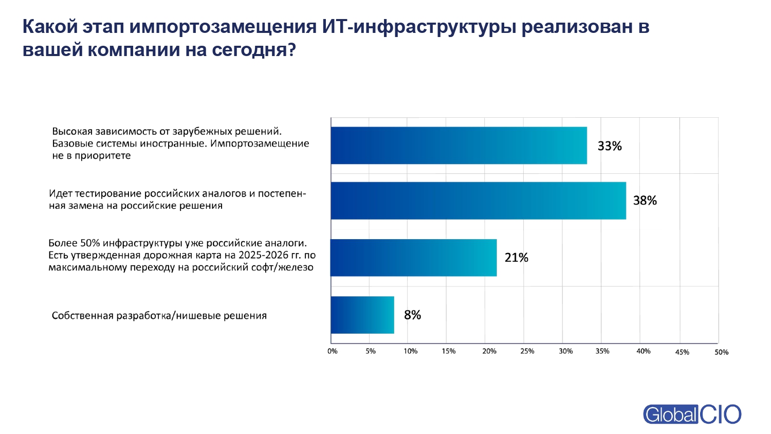 38% компаний находятся в активной фазе перехода: тестируют и заменяют зарубежные системы российскими аналогами. 29% уже полностью перешли на отечественные продукты или собственную разработку. При этом 33% продолжают использовать зарубежные решения.