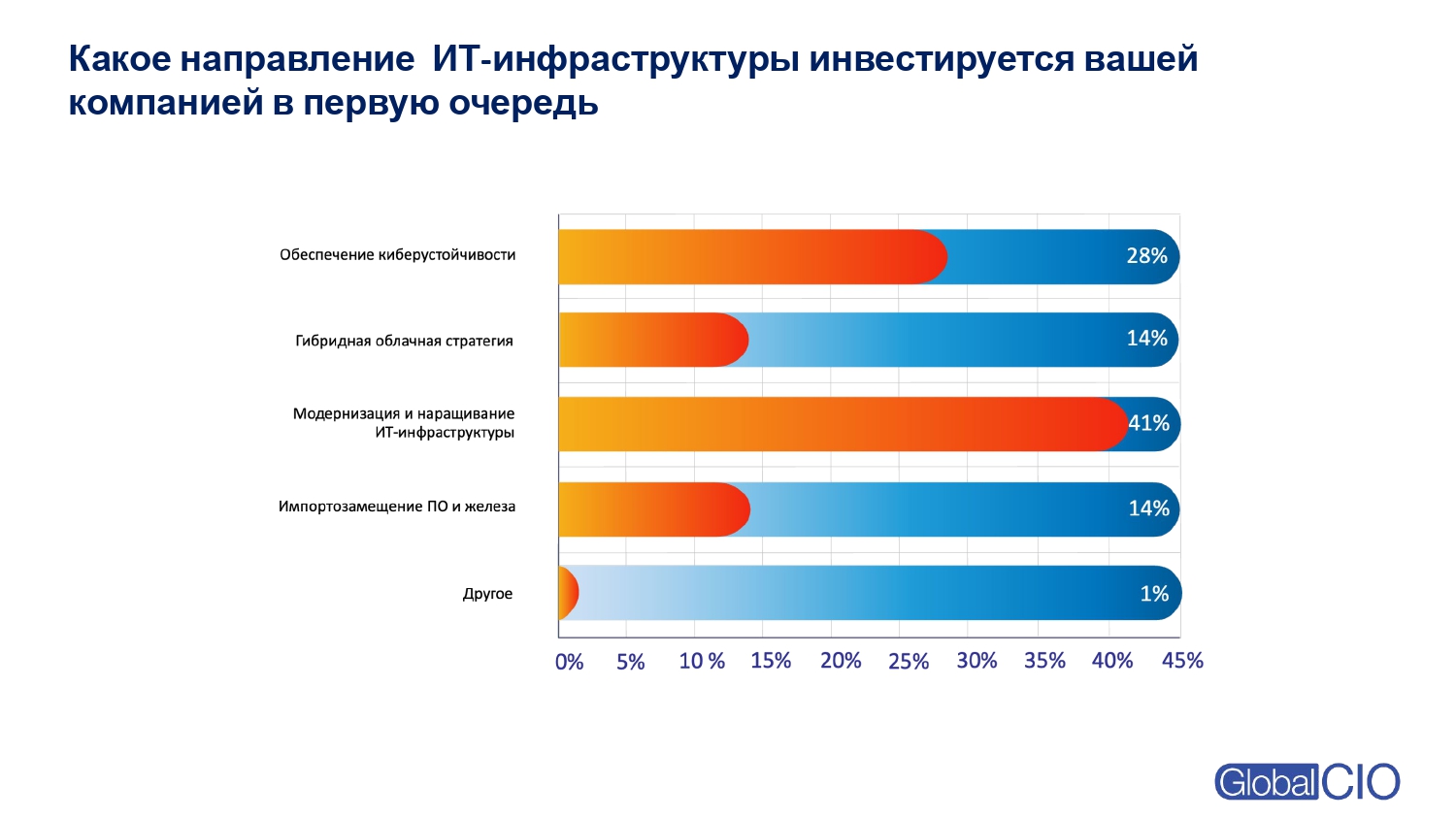 На вопрос о первоочередных инвестициях компании чаще всего называли модернизацию ИТ-инфраструктуры — этот вариант выбрали 41% участников.
