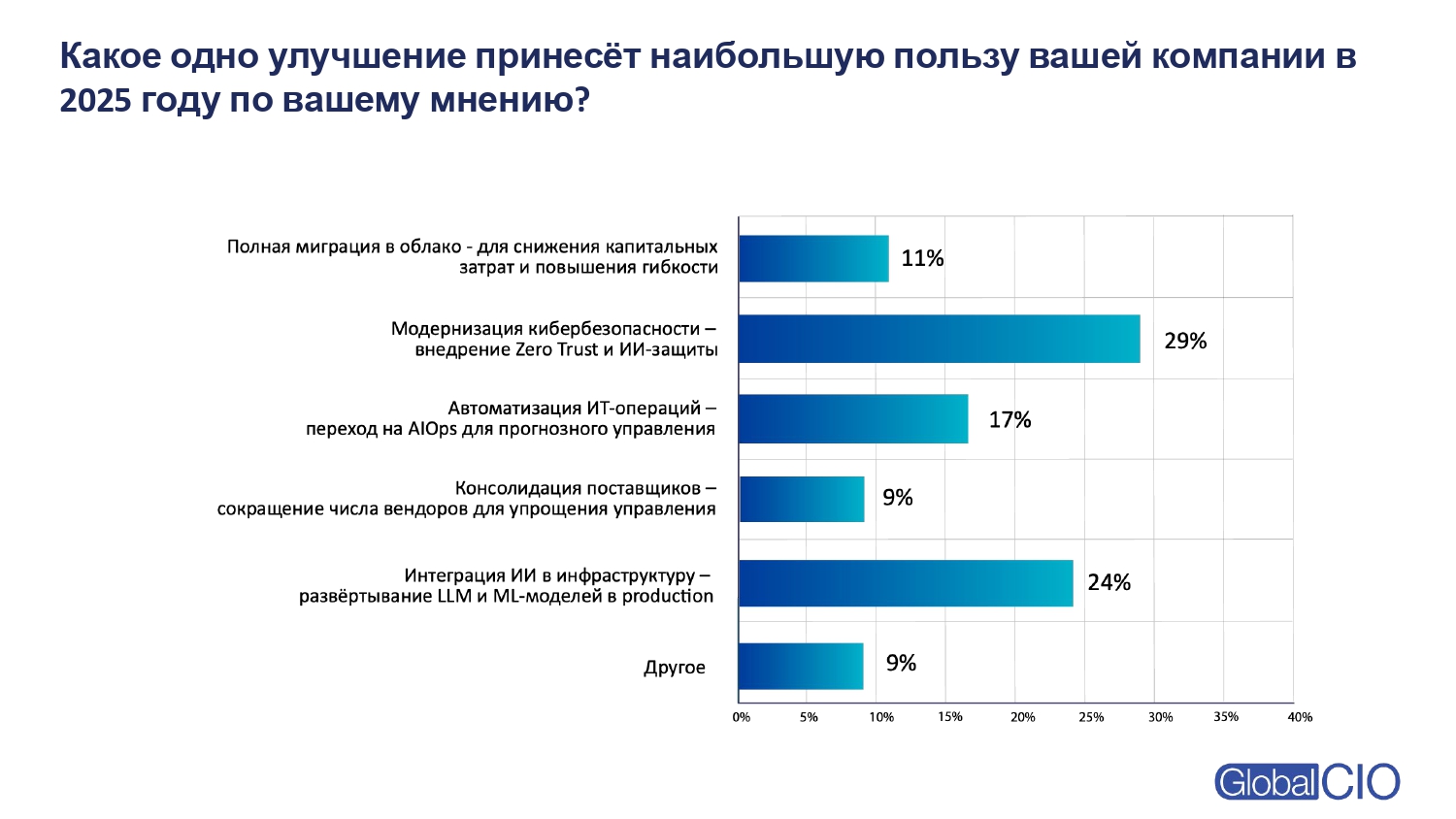 Самым полезным улучшением для компании в ближайшей перспективе респонденты считают усиление киберустойчивости — 29% голосов. На втором месте — интеграция искусственного интеллекта в инфраструктуру (24%).
