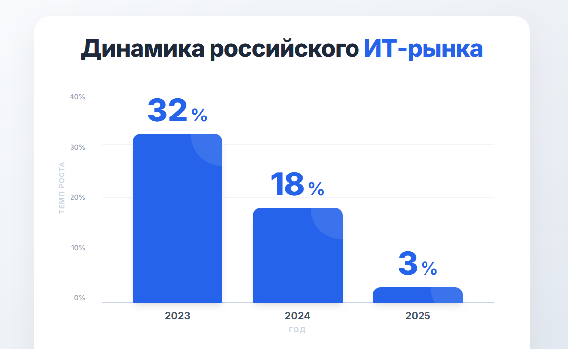 2025 год на российском ИТ-рынке подтвердил тренд на охлаждение после двухлетнего ралли. Согласно статистике рост составил всего около 3-5% против 32% и 18% в 2023 и 2024 году. Компании переходят в режим оптимизации и осознанного спроса на технологии. А экономическая эффективность и надежность решений стали главными критериями выбора.
