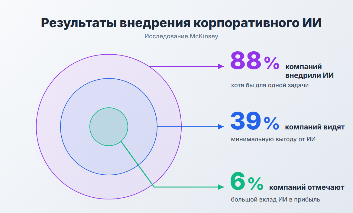 В мировой практике уровень вовлечения бизнеса в ИИ-трансформацию можно оценивать как очень высокий. По данным исследования McKinsey, 88% опрошенных компаний внедрили искусственный интеллект для решения хотя бы одной задачи. При этом в части экономических результатов статистика уже не такая оптимистичная. Всего 39% компаний говорят хотя бы о минимальной выгоде реализованных проектов, и только 6% – отмечают значительный вклад ИИ в эффективность и операционную прибыль.