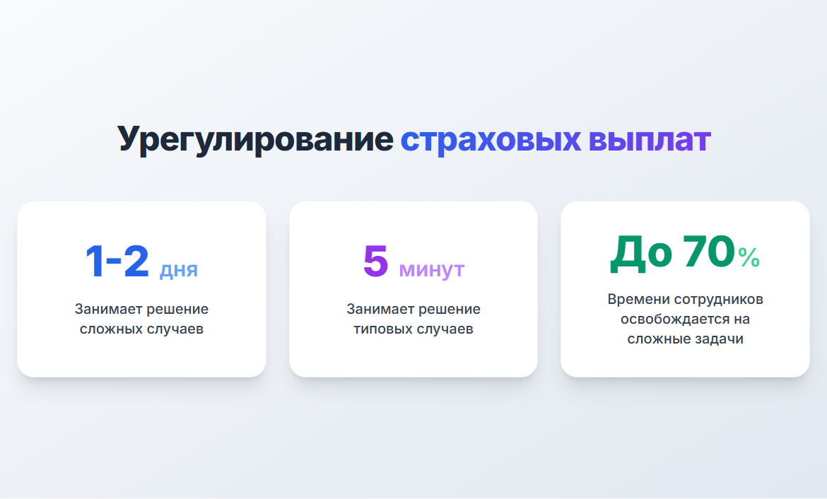 - Среднее время урегулирования сложных страховых случаев сокращается до 1-2 дней.