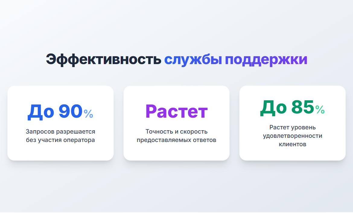 - Снижает нагрузку на службу поддержки: в среднем около 45% запросов разрешаются без участия оператора. В некоторых кейсах показатель может достигать 85-90%.