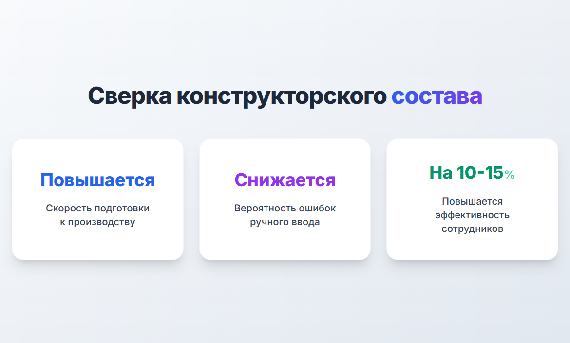 - Ускоряется подготовка к производству: автоматическая сверка конструкторской документации не приводит к задержкам и потерям.