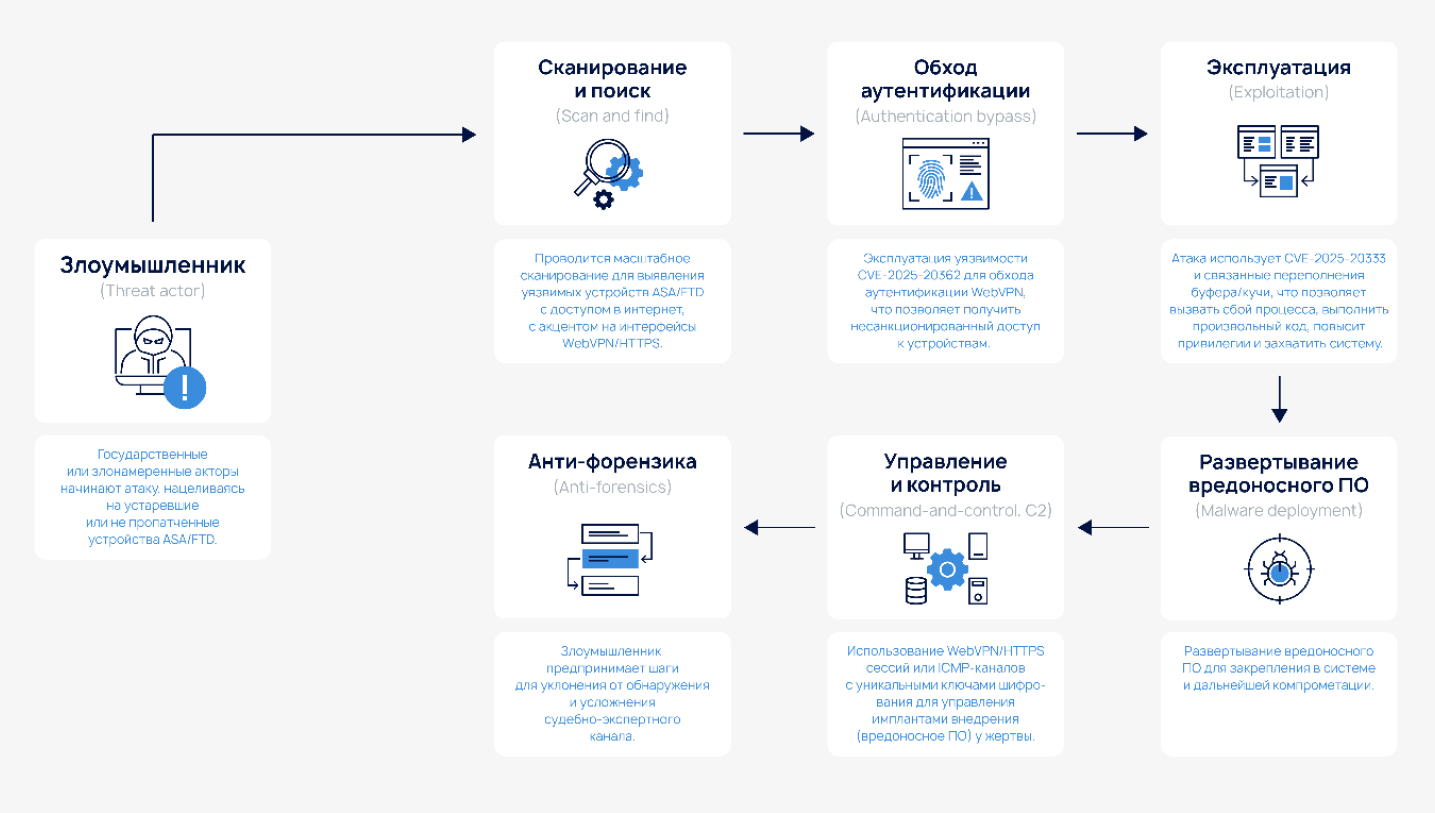 В реальных инцидентах атакующие первично эксплуатируют уязвимость CVE-2025-20362 в веб-сервере VPN продуктов Cisco (ASA/FTD). Эксплуатация этой уязвимости даёт неаутентифицированный доступ к защищённым устройствам. Полученный доступ затем используют для дальнейшей эксплуатации уязвимости CVE-2025-20333 (поскольку для CVE-2025-20333 требуется аутентификация, которую атакующие получают через CVE-2025-20362).