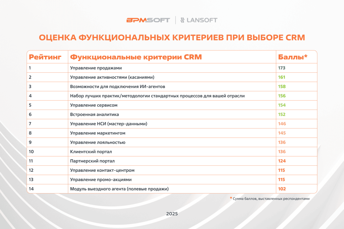 Ключевые функциональные критерии при выборе CRM. Наиболее значимыми для респондентов при выборе CRM являются модули управления продажами и клиентским сервисом, а также возможности подключения инструментов ИИ для обработки больших объемов данных, включая неструктурированные – например, голосовые записи звонков. Высоко ценятся наличие лучших практик по настройке бизнес-процессов для максимально эффективной эксплуатации системы и встроенная аналитика, востребованная даже при использовании внешних BI-решений в крупных компаниях.