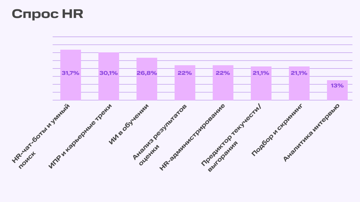 ИИ чаще всего используется в зонах с минимальными управленческими рисками: лидируют подбор и скрининг резюме (28%) и корпоративное обучение (23%). При этом текущая практика отстает от ожиданий рынка. Среди наиболее востребованных, но пока недостаточно распространённых сценариев респонденты называют HR-чат-боты и умный поиск (32%), применение ИИ для составления карьерных треков и индивидуальных планов развития (30%), а также ИИ в обучении (27%).
