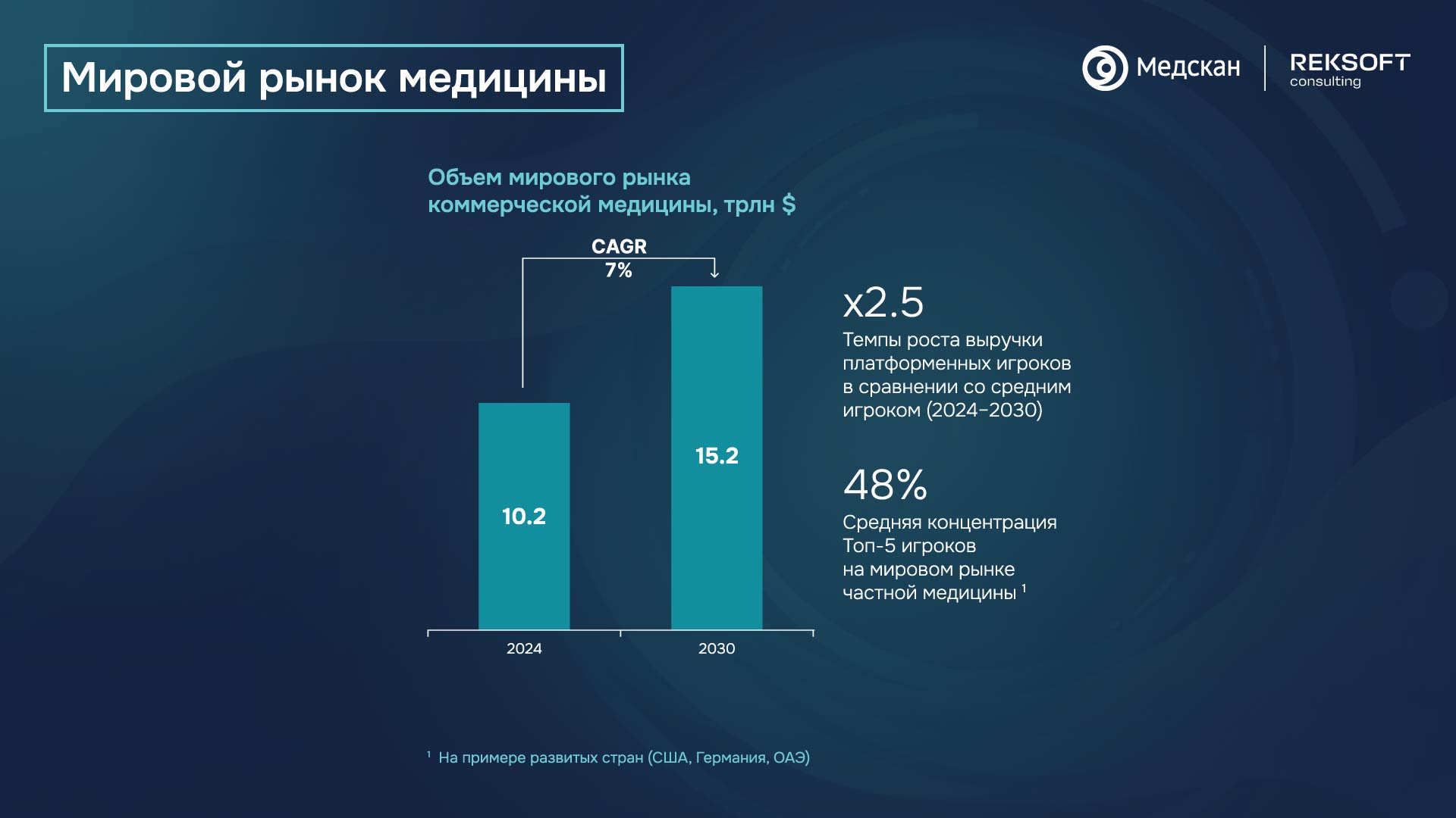 Объем мирового рынка здравоохранения к 2030 году составит порядка $28 трлн. При этом большая его часть – $15,2 трлн (54%) будет приходиться на коммерческую медицину, а $12,6 трлн (46%) – на государственный сектор. Рынок характеризуется высокой степенью концентрации – топ-5 игроков занимают в среднем 48% на мировых рынках частной медицины.