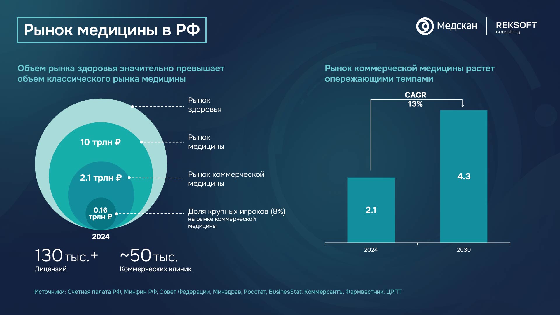 К 2030 году общий объем рынка здравоохранения в РФ составит 18,4 трлн руб., доля государственной медицины продолжит лидировать и составит 9,8 трлн руб. (53%), хотя коммерческая часть рынка заметно усилит свои позиции и составит 8,6 трлн руб. (47%). Важной характеристикой отечественного рынка является то, что при относительно высокой доле от ВВП страны (5,5%) медицинская сфера характеризуется низкой консолидацией. Российский рынок еще проходит этап консолидации за счет покупки активов и объединения их в закрытые экосистемы. Сегодня ни одна из топ-5 сетей клиник не обладает долей более 2%. При этом в среднем каждая из них аккумулирует до 70 клиник, способных пропустить 15 млн посещений в год.