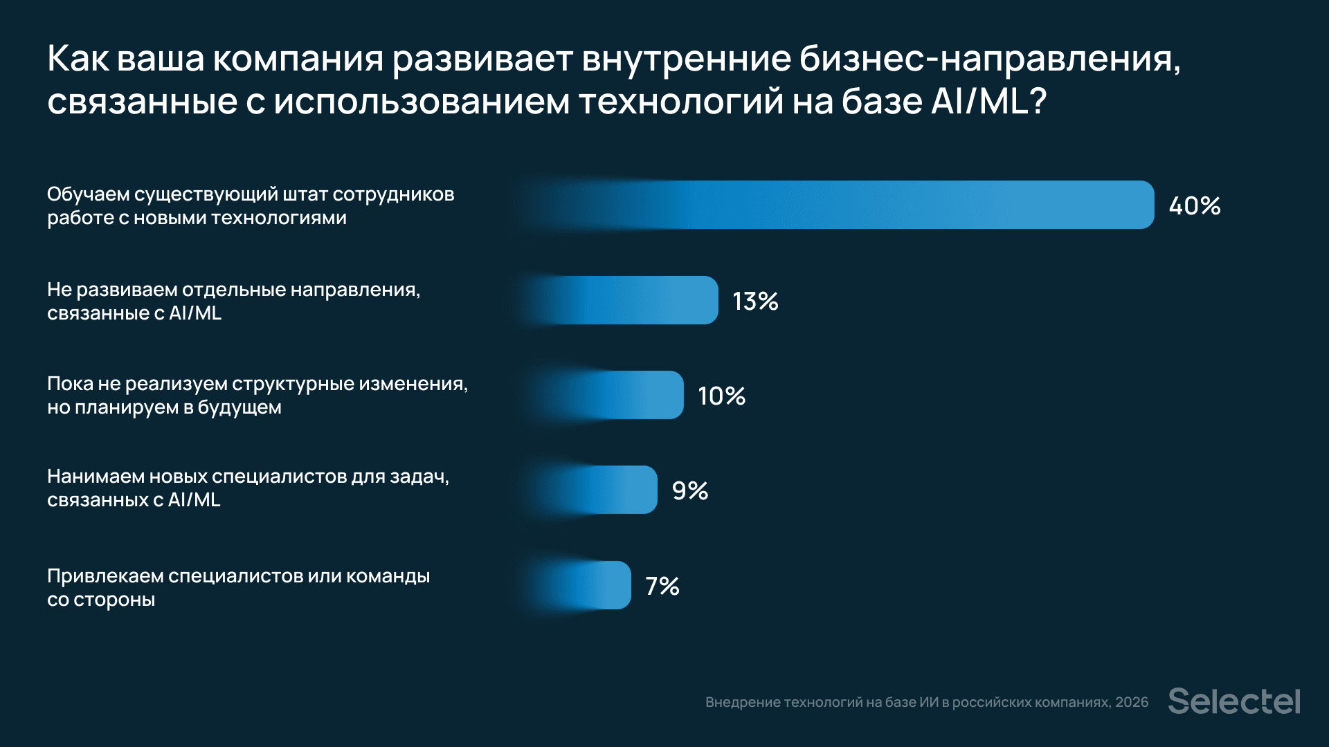 Большинство российских компаний, развивающих внутренние бизнес‑направления с использованием ИИ, делают ставку на обучение и развитие существующих сотрудников — так ответили 40% респондентов. Лишь меньшая часть организаций обращается к внешней экспертизе: 9% нанимают новых специалистов, а 7% привлекают внешние ИТ‑команды для реализации проектов. При этом 13% респондентов пока не развивают отдельные направления, связанные с ИИ, а 10% планируют сделать это в будущем.