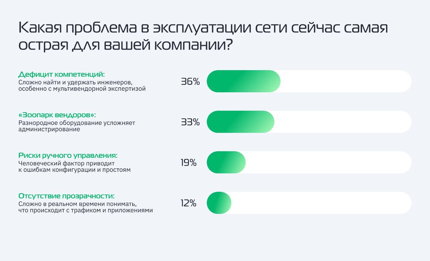Острая нехватка квалифицированных ИТ-кадров (36%) напрямую связана с масштабной перестройкой ИТ-ландшафта. Треть опрошенных компаний (33%) признаются, что управление инфраструктурой критически усложнилось из-за образовавшегося «зоопарка вендоров» — одновременного использования российского, азиатского и западного оборудования. В таких условиях традиционное ручное управление сетью становится все более рискованным: 19% респондентов отмечают, что человеческий фактор все чаще приводит к ошибкам конфигурации и простоям. Еще 12% указали на отсутствие прозрачности в управлении сетью. У компаний появляются новые сервисы, усложняется маршрутизация, добавляются гибридные структуры. Отследить все это вручную, без использования инструментов мониторинга ИТ-инфраструктуры крайне сложно.