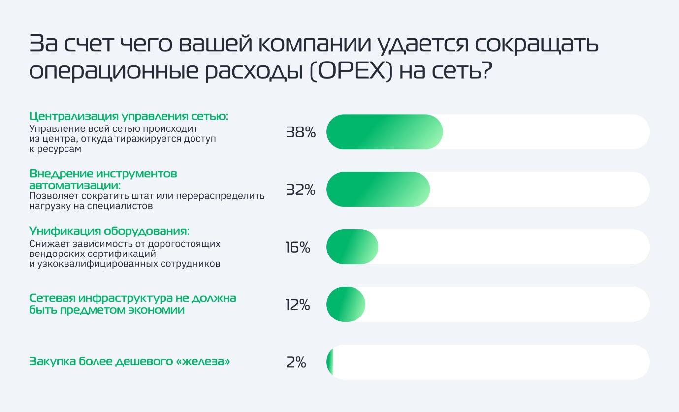 Чтобы снизить зависимость от узкопрофильных специалистов и сократить операционные расходы (OPEX), компании меняют архитектурные подходы. Главным драйвером экономии для 38% респондентов стала централизация управления. Единый центр позволяет быстро тиражировать доступ к ресурсам и лучшие практики на новые филиалы и направления бизнеса, исключая необходимость держать сильную команду инженеров на каждой локации.