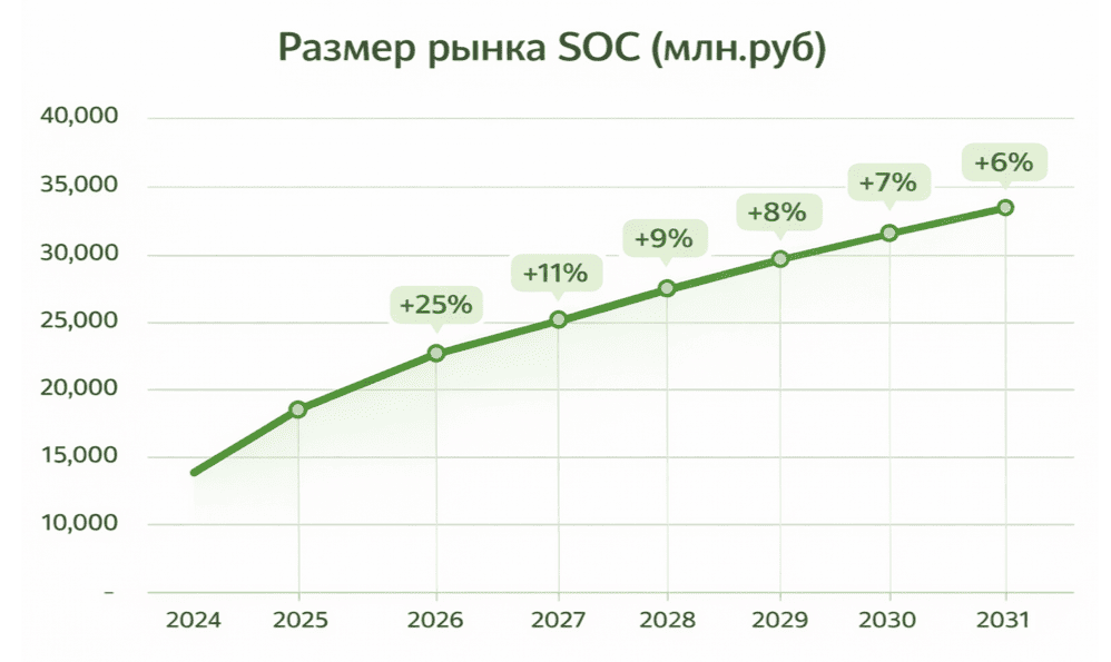 Это, в свою очередь, приведет к росту рынка SOC в целом: по итогам 2026 года он должен увеличиться примерно на 25%, а его объем – превысить 23 млрд рублей. Постепенно динамика будет замедляться в связи с насыщением рынка и макроэкономическими факторами. По предварительным прогнозам компании, к 2031 году размер рынка SOC приблизится к планке в 35 млрд рублей – среднегодовой прирост за пять лет составит около 11%.