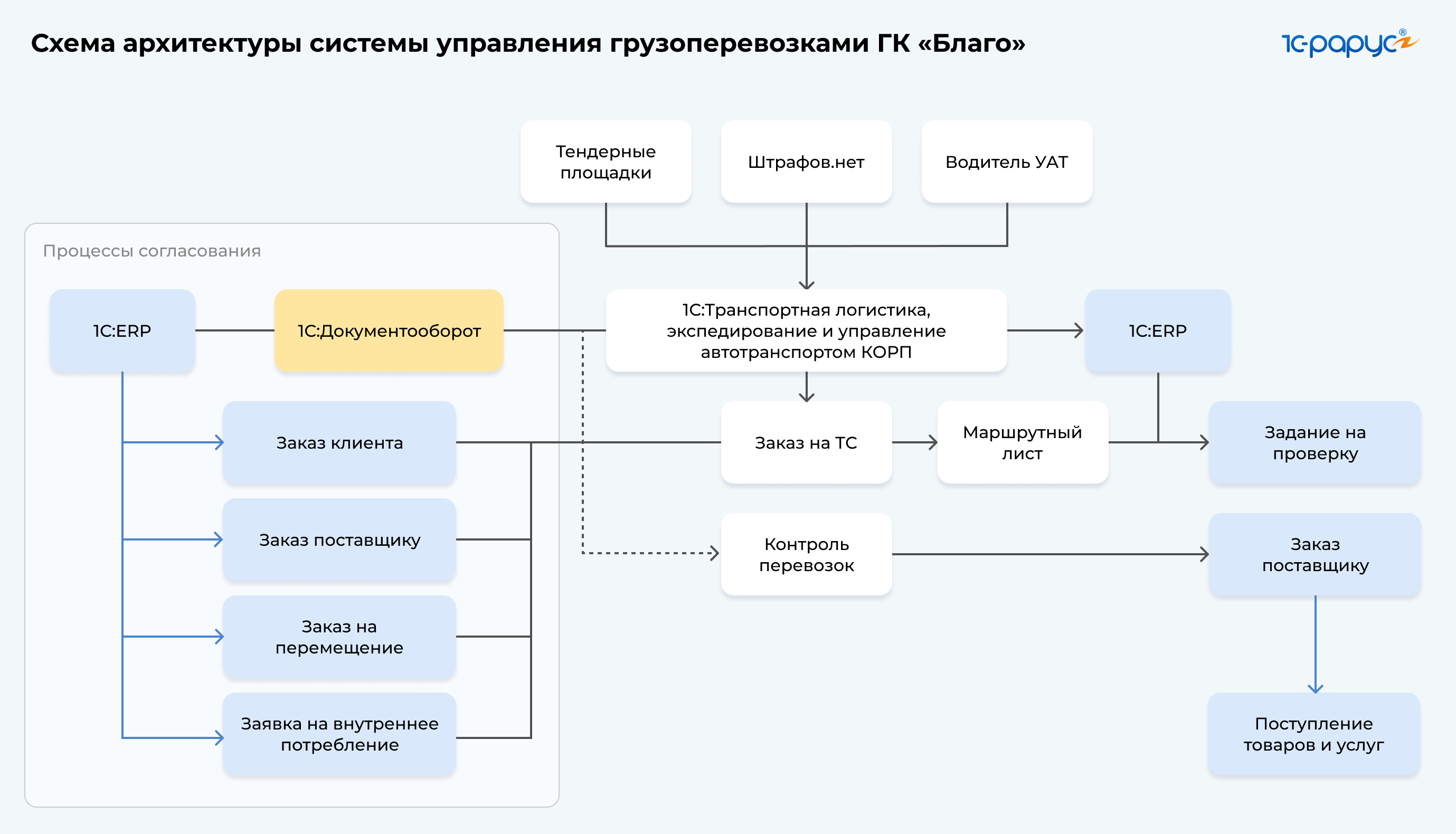 Заказчиком проекта выступило управление по организации автомобильных перевозок ООО «Управляющая компания "Благо"». Это критически важный структурный элемент ГК «Благо». Управление отвечает за оптимизацию движения материальных потоков на всем протяжении цепочки создания стоимости – от первичного сельскохозяйственного сбора культур до конечного потребителя.