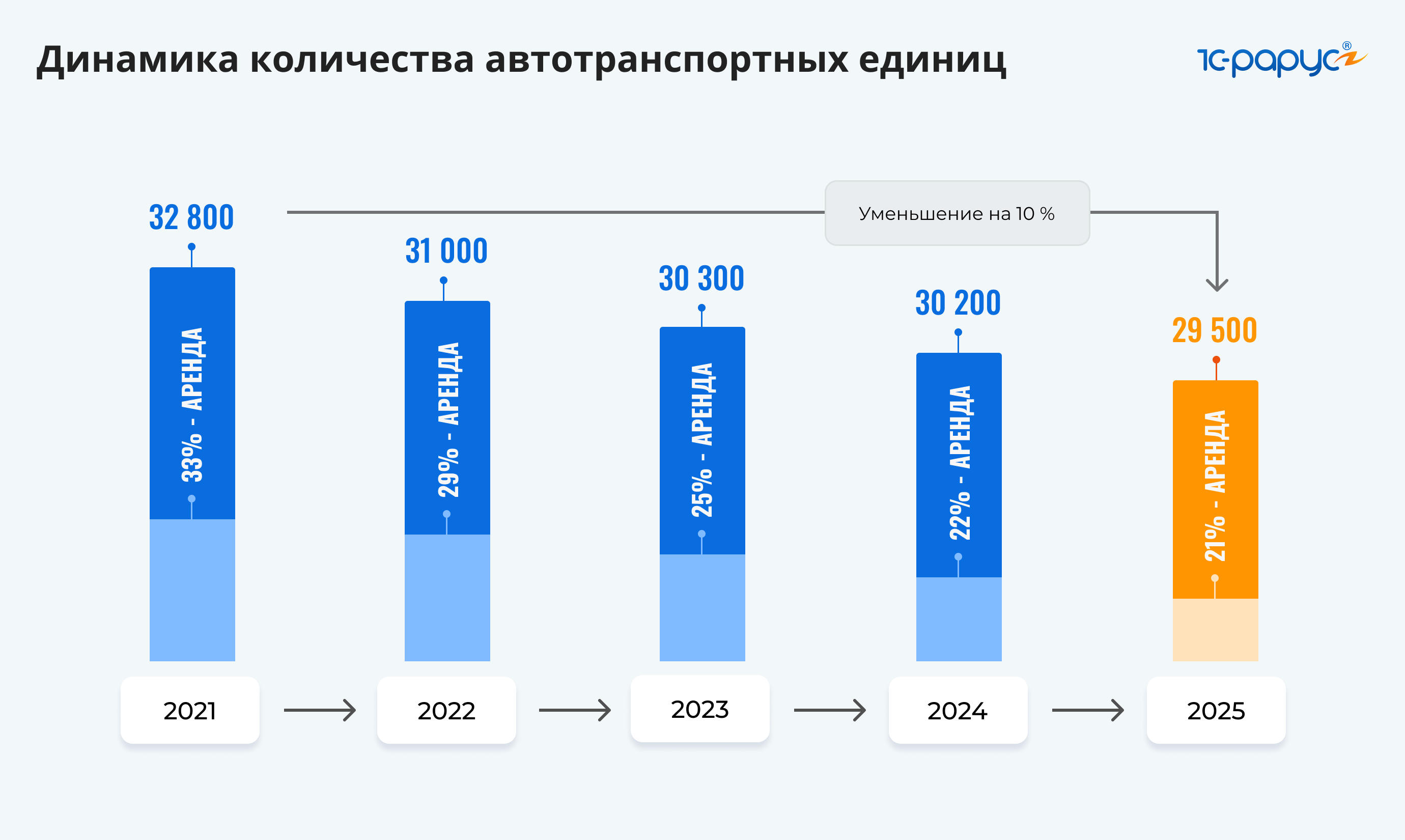 На 10% оптимизировано количество транспортных единиц в автопарке РЖД с момента запуска системы транспортного аутсорсинга и электронного технологического документооборота. Значительно сокращены расходы на содержание автопарка, техническое обслуживание и ремонты, оптимизированы налоговые отчисления, что позволяет направлять сэкономленные средства на модернизацию инфраструктуры и повышение качества автотранспортных услуг.