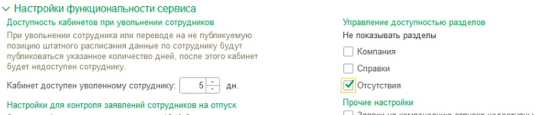 У администратора базы ЗУП есть возможность включать и отключать отображение раздела прямо из формы настроек 1С:Кабинет сотрудника, аналогично типовому отключению разделов "Компания" и "Справки".