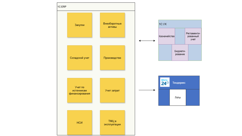 Целевая система «1С:ERP Управление предприятием» интегрирована в IT-ландшафт АО «Медицина» и связана с системой «1С:Управление холдингом» и тендерной площадкой на платформе Битрикс24.