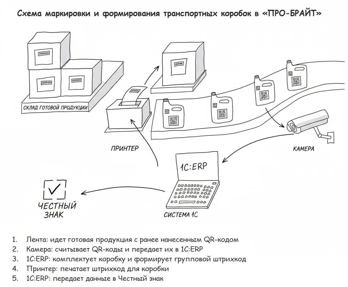 Считывание данных с видеокамер. На всех производственных линиях установлены камеры, которые считывает QR-код каждой единицы товара и передают их автоматически в систему 1С. Система, в свою очередь, фиксирует все считанные коды для дальнейшей их передачи в «Честный знак».