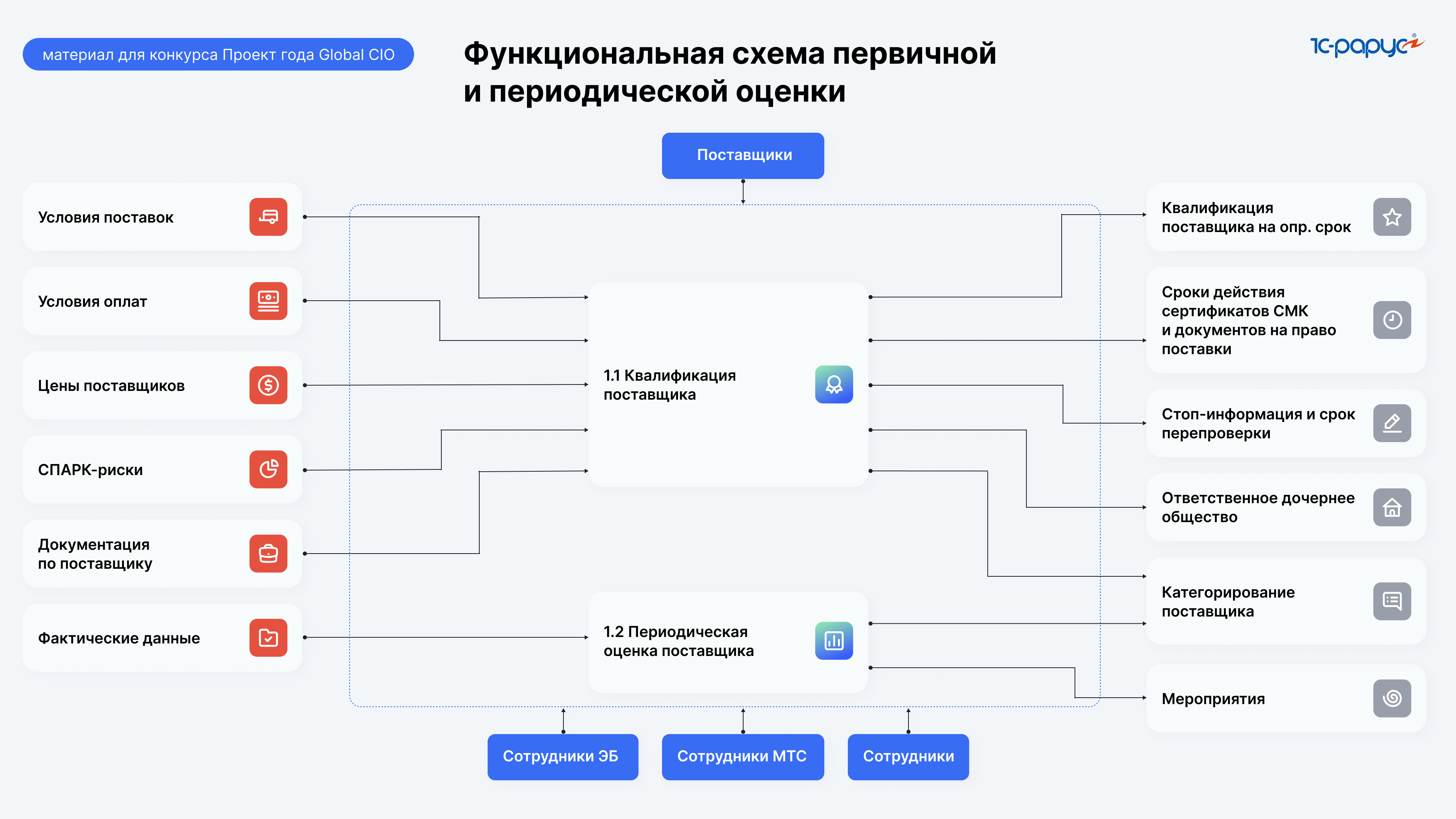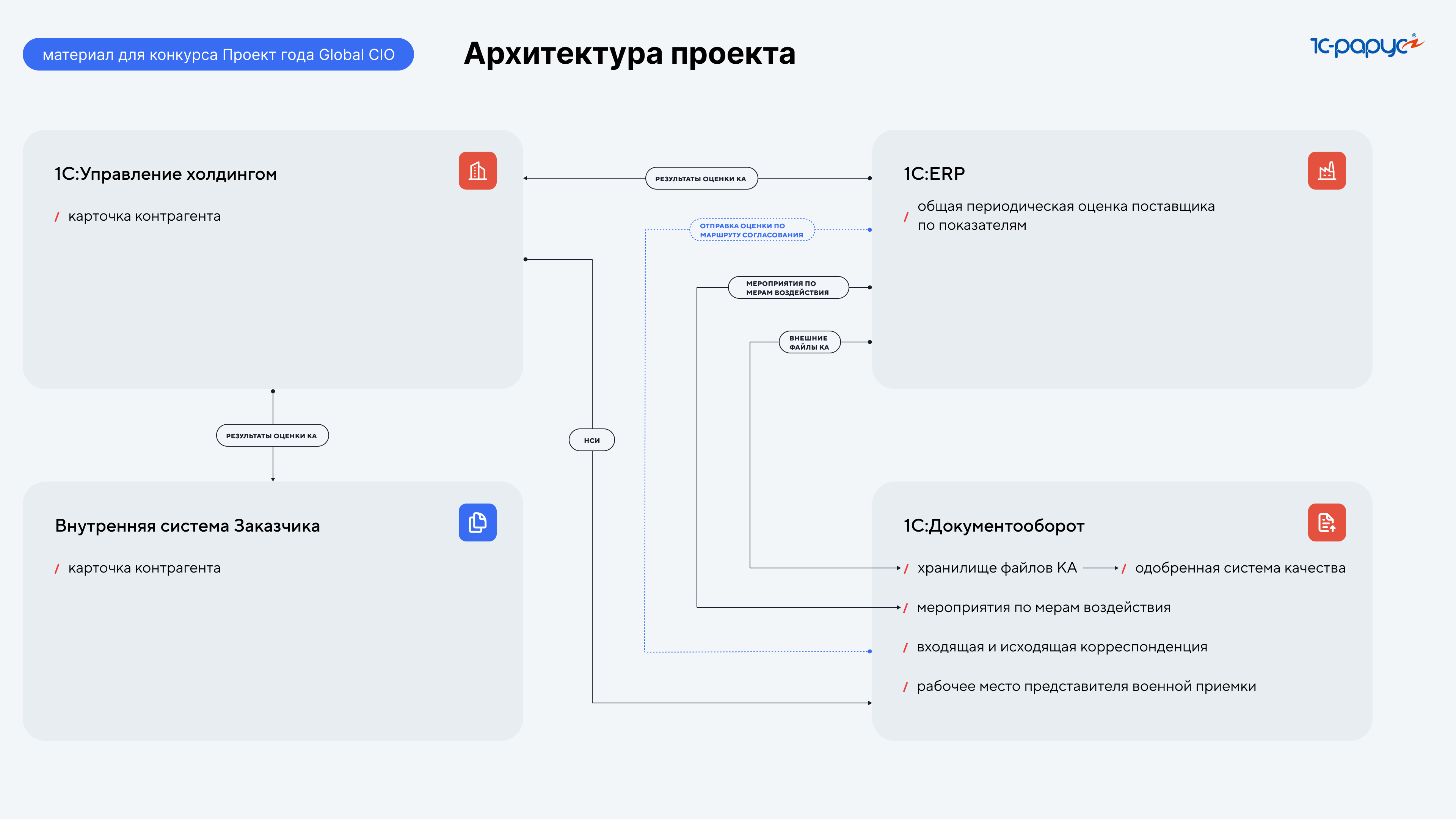 Реализован обмен данными между «1С:Документооборот», «1С:ERP», «1С:Управление холдингом», «1С:Зарплата и управление персоналом» для обмена нормативно-справочной информацией по сотрудникам, пользователям, контрагентам. Настроены интеграции с историческими базами данных для передачи результатов выполненной квалификации и итоговой балльной оценки поставщиков. Благодаря унификации данных выросла эффективность управления бизнес-процессами.