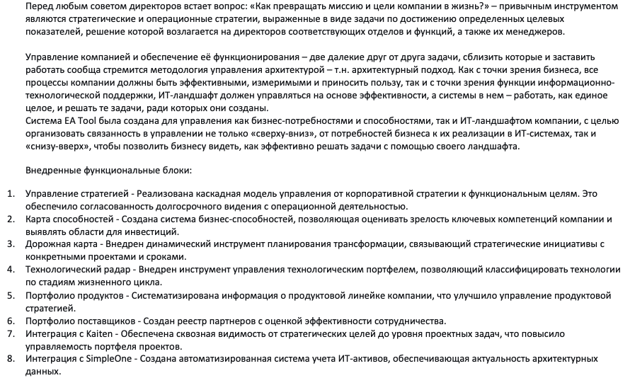 Результат: Roadmap компании превращается из набора слайдов в живой, связанный план, где видно, как каждый проект продвигает нас к целевой архитектуре