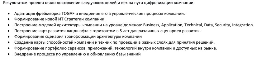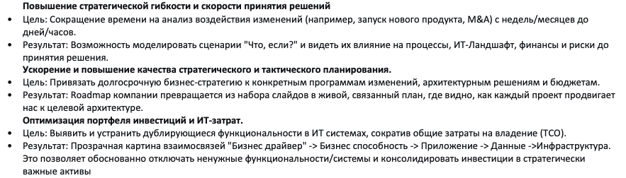 Результат: Прозрачная картина взаимосвязей "Бизнес драйвер" -> Бизнес способность -> Приложение -> Данные ->Инфраструктура. Это позволяет консолидировать инвестиции в стратегически важные активы.