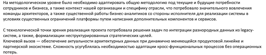 Ключевой вызов — обеспечение актуальности архитектурных данных при динамично меняющейся продуктовой линейке и партнерской экосистеме. Сложность усугублялась необходимостью адаптации кросс-функциональных процессов без операционных потерь.