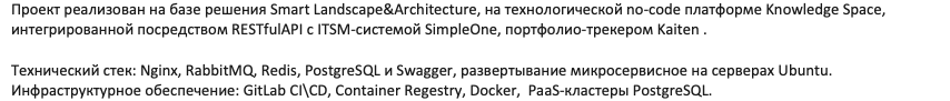 Проект реализован на базе решения Smart Landscape&Architecture, на технологической no-code платформе Knowledge Space, интегрированной посредством RESTfulAPI с ITSM-системой SimpleOne, портфолио-трекером Kaiten.
