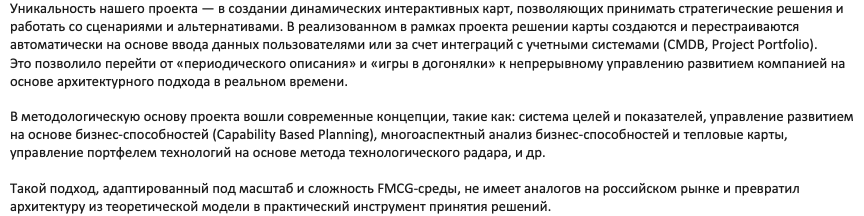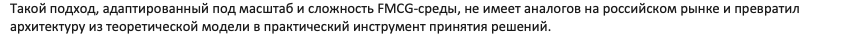 Такой подход, адаптированный под масштаб и сложность FMCG-среды, не имеет аналогов на российском рынке и превратил архитектуру из теоретической модели в практический инструмент принятия решений.