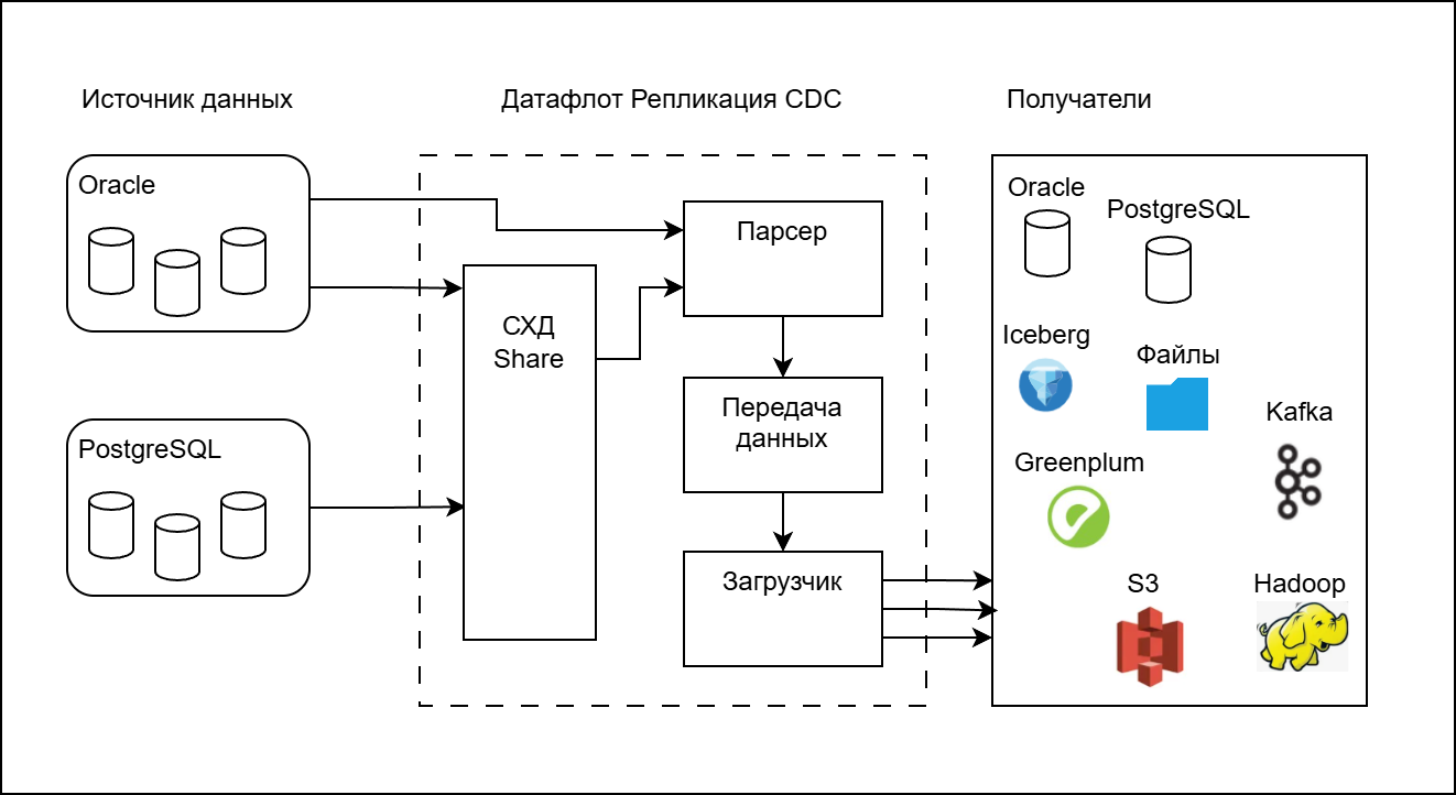 Обеспечить универсальность - поддержку существующих и перспективных источников и приемников данных (Oracle, PostgreSQL, Greenplum, Hadoop, S3, Iceberg, Tarantool/Picodata, Kafka), возможность репликации данных между разными СУБД