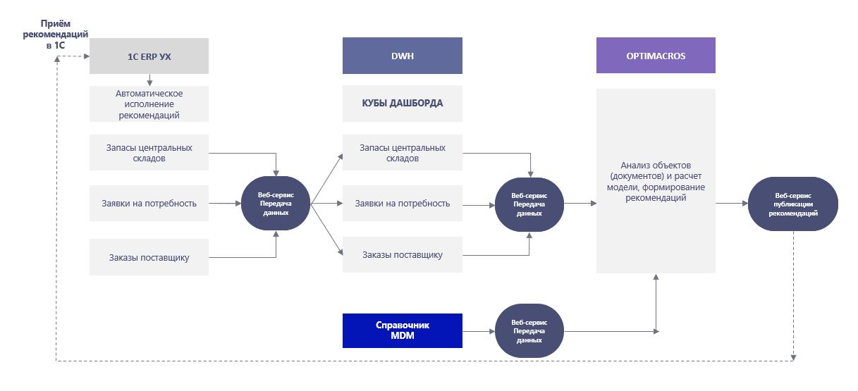 Проект, выполненный командой Wone IT совместно с командой Uralmine, стал доказательством зрелости и гибкости платформы, способной автоматизировать сложные сценарии закупок, организован сложноинтегрированный процесс обмена данными (таблица, рис. 1), формирования рекомендаций системы по оптимизации объемов закупки за счет вовлечения текущих запасов, материалов в пути и запасов предприятий группы компаний Uralmine в реальном времени.