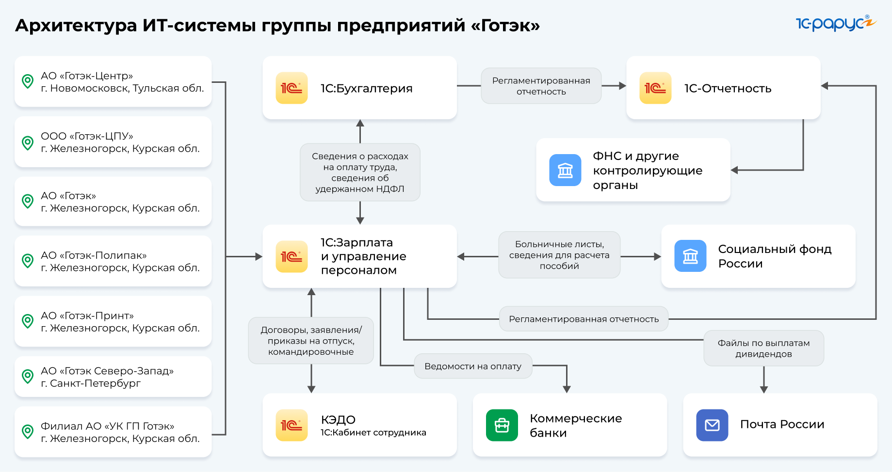 «1С:Зарплата и управление персоналом» обменивается с «1С:Бухгалтерия» сведениями о расходах на оплату труда и об удержанном НДФЛ по 7 предприятиям группы «Готэк».